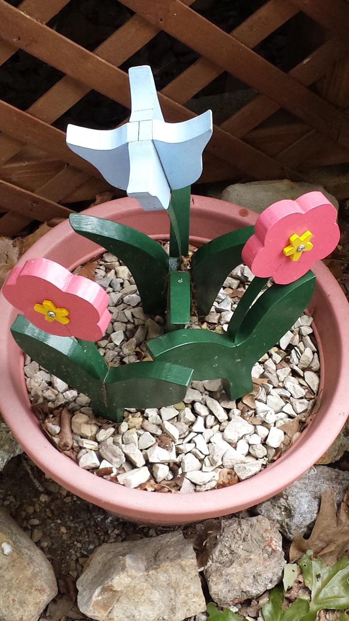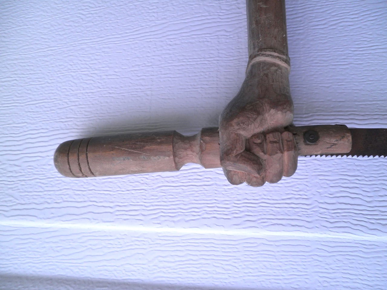 What do you do when the critters outside eat your flowers? If you ask Jon Slaton, he will tell you that the best thing to do is to make some wooden flowers and stick them in your pots. Jon, who lives in the Ozark mountains in Missouri, wrote to me after reading the story on the frame saws that my students had built. He wanted to share with me one of his brother’s (Deke Slaton) achievements — a great looking frame saw in the shape of two hands holding the saw blade in between (see pictures at the bottom of this entry).