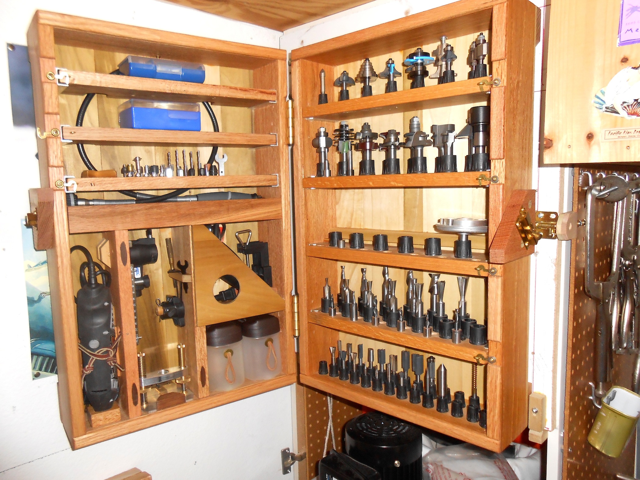 Ken Kennedy’s cabinet also has a special effect focused around the shelves. When small hooks at the ends of the shelves are undone, the shelves can be pulled out. That adds a nice feature to the setup over and above accessibility to router bits and whatever else you choose to store in your cupboard, such as guide bushings, extra bearings and collets. Kennedy_1It adds mobility. A free-to-move shelf full of bits can be carried directly to the router table or workbench, if you’re operating a handheld machine. Plus, Ken decided to add a frame around the door panel so he could increase his storage area. As you can see in the photo, that’s a great spot for his rotary tool and all its accoutrements.