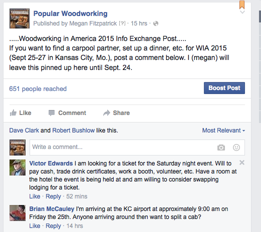 So, for lack of a better fast and effective way to do it, I’ve created a “sticky post” atop Popular Woodworking’s Facebook page – it will stay there until the the late evening on Sept 24 – at which point I’ll leave it up, but “unstick” it. (OK, who am I kidding…I’ll probably forget to unstick it until days later!)