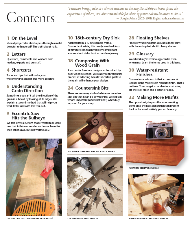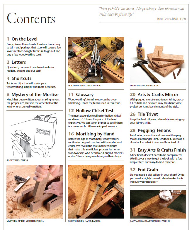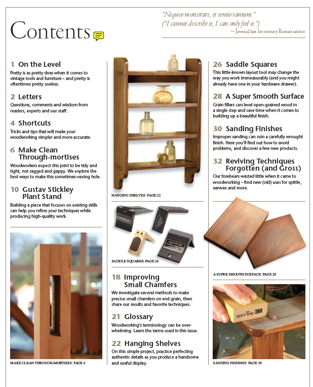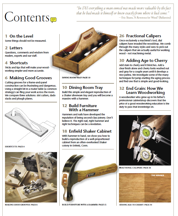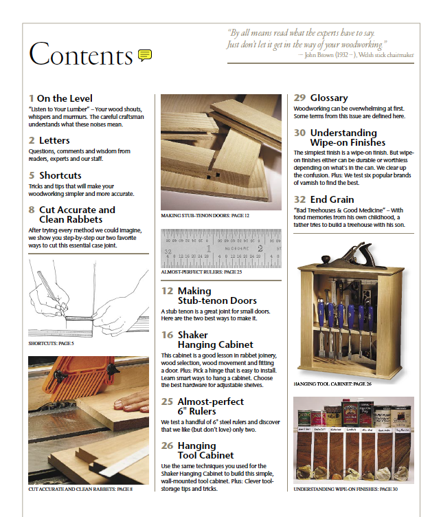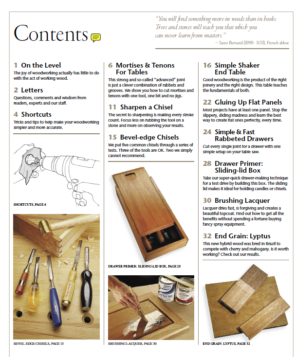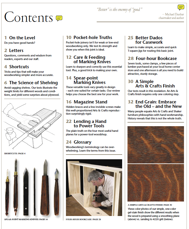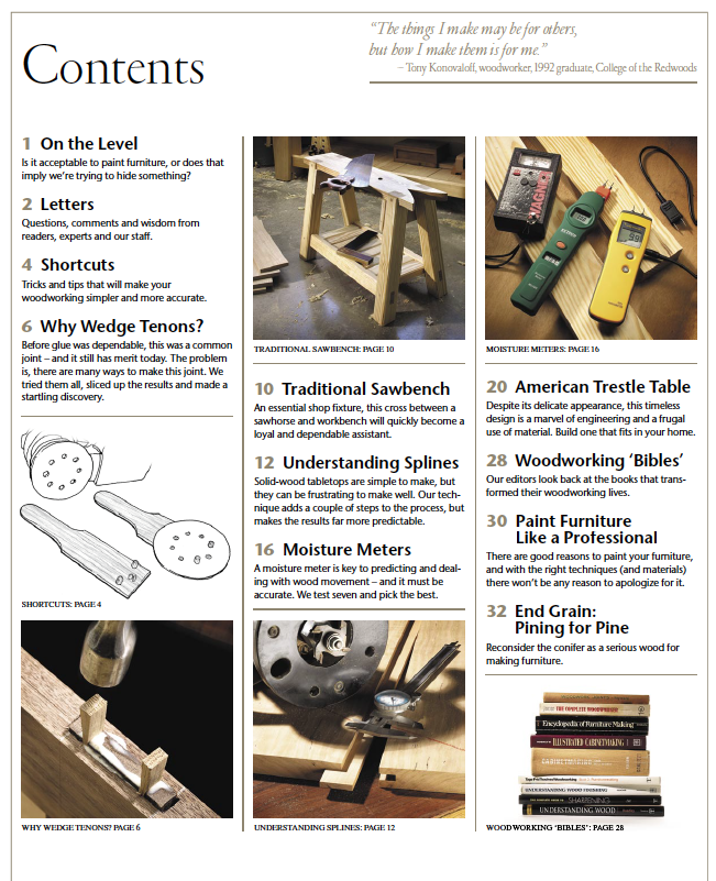 Each issue was put together essentially like a mini book. We’d introduce a must-have tool, test various makes of it and teach you how to use it. Then, we’d offer up a simple project using that tool and the techniques just explained, then a larger, more advanced project that built on the skills just practiced. And each issue’s finishing article related back to one of the projects as well (plus there was a glossary to explain perhaps-unfamiliar terms used in the “book,” and a back cover “poster” with lovely illustrations and information on must-know woodshop subjects including wood types, sandpaper, try squares and router collets). The projects were all classics – Arts & Crafts, Shaker and other time-tested styles.