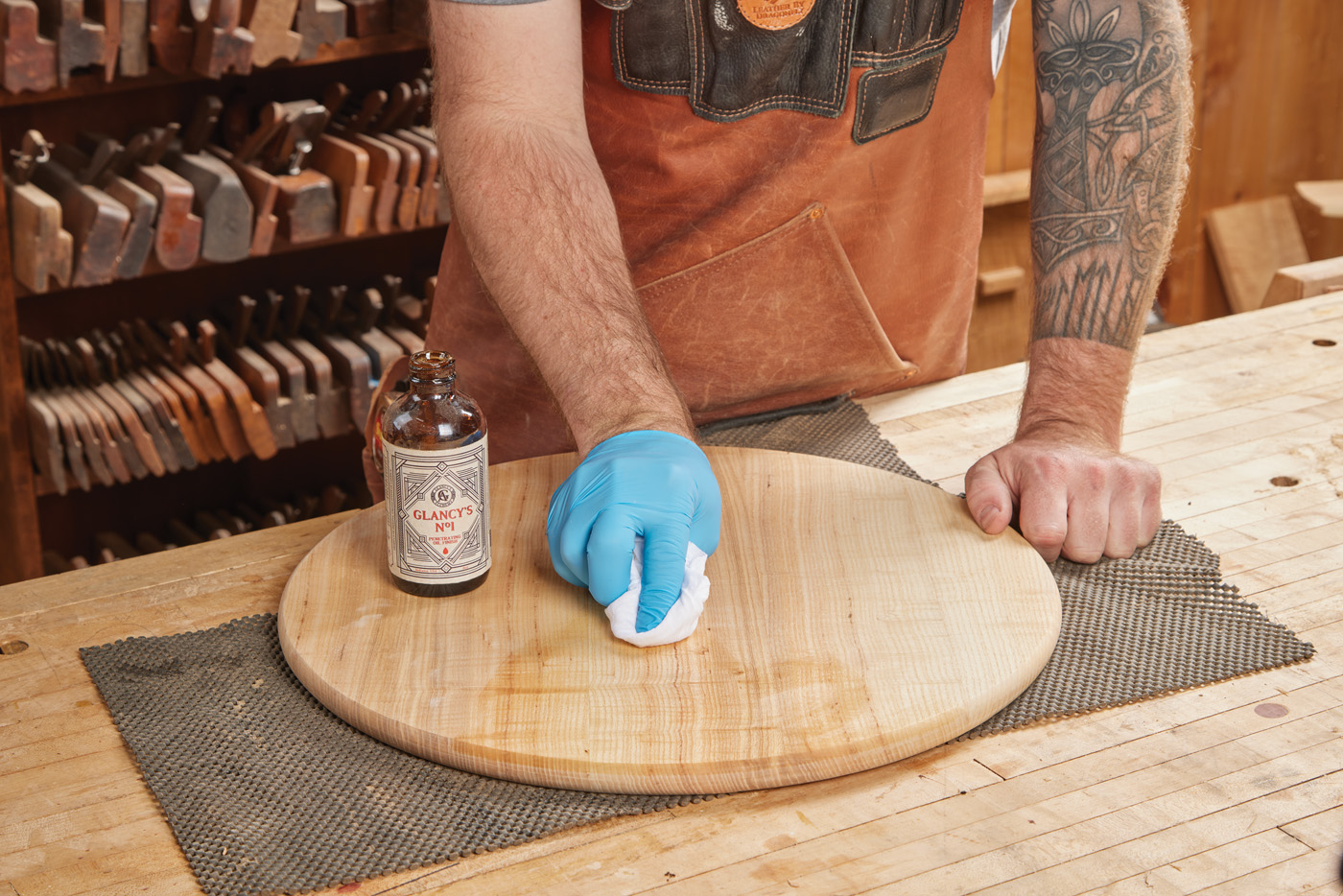 This finish is a two-step finish. The first step is to apply a penetrating oil that soaks deep into the fibers and highlights the figure. I use Glancy’s No. 1 oil for this. This is flooded on and allowed to absorb before wiping the surface dry. After 24 hours, I come back with a white Scotch-Brite and lightly buff the surface. This cuts back any Glancy’s on the top, and opens it up for the next layer, which is Danish Oil. A final coat of paste wax adds extra protection for the day-to-day wear.
