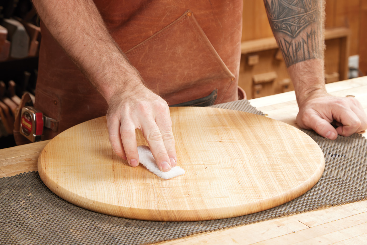 My first step is to get a good surface for my finish to soak into. I start (usually) with a rough sanding block. 120-grit or so. Sand the entire surface, and wipe away the dust. What you’ll find is that the dust settles in any small areas of tearout. If you have some of those spots, I tackle them with a card scraper or a freshly sharpened plane. Then, it’s onto sanding. With this finish (penetrating oil), I sand up through 320-grit.