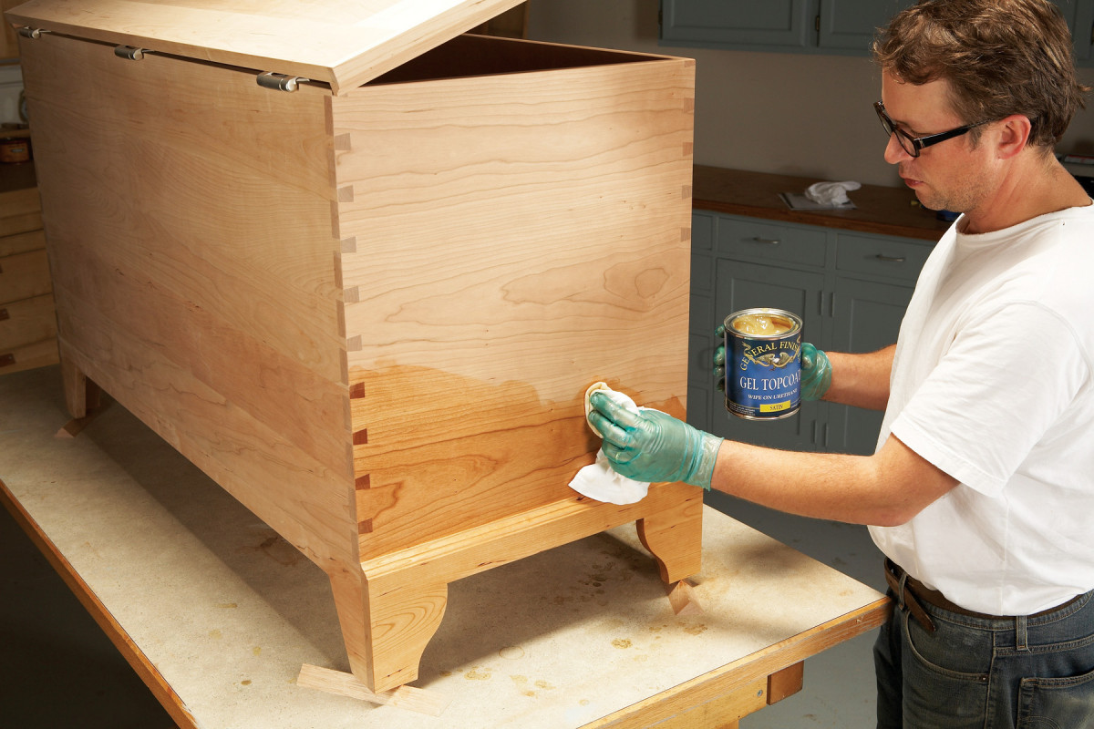 Photo 1. Wipe on two coats of General Finishes’ Gel Topcoat, after finish sanding to 180 grit. This step seals the wood’s pores.