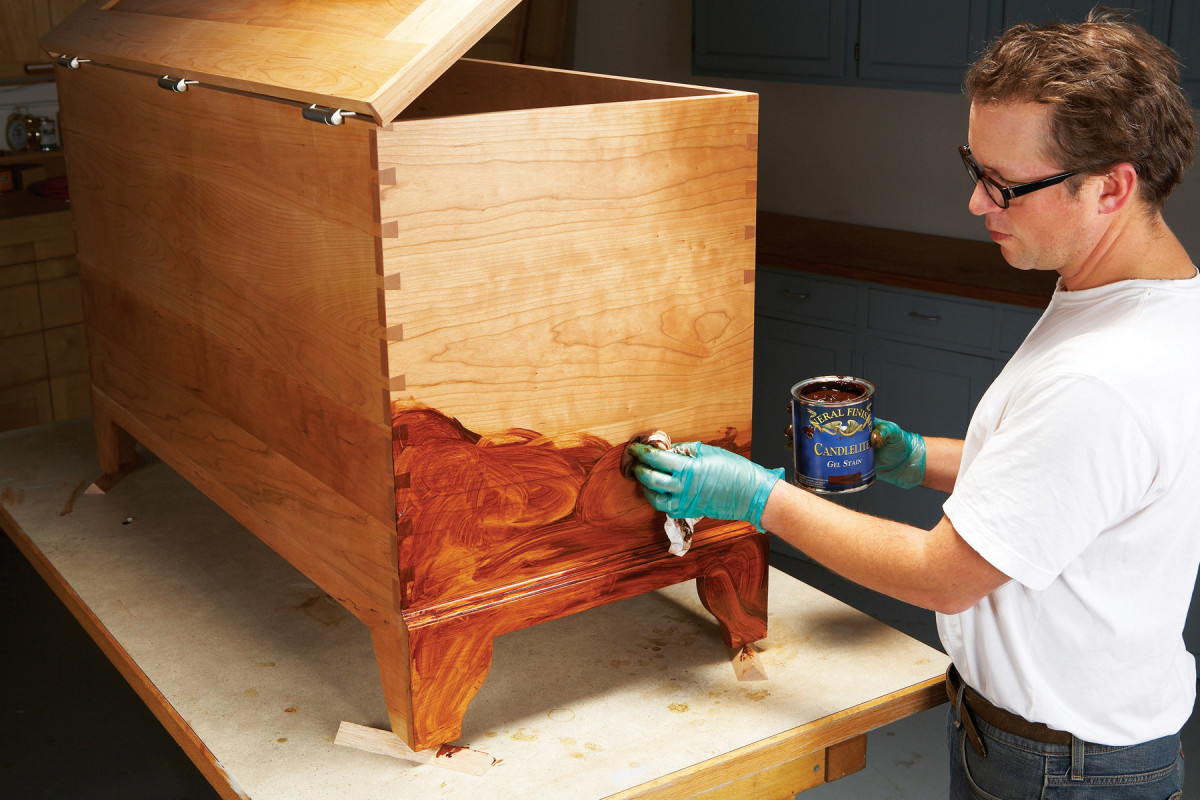 Photo 2. Wipe on one or more coats of General Finishes’ Candlelite gel stain. Because the wood’s surface is sealed, it adds an even layer of color that makes cherry look like it has aged naturally.