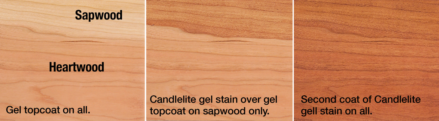 Usually you can’t apply stain over a finish. But the process works with these gel stains because they’re actually colored gel varnish. Applying Candlelite gel stain over Gel Topcoat is similar to applying a layer of toned finish, and because the wood’s surface has already been sealed, the stain doesn’t darken the pores. For the same reason, this method reduces blotching. Another benefit of sealing the wood before staining is that if you don’t like the color the stain imparts, you can wipe it off with mineral spirits (as long as the stain is still wet), without hurting the Gel Topcoat underneath.