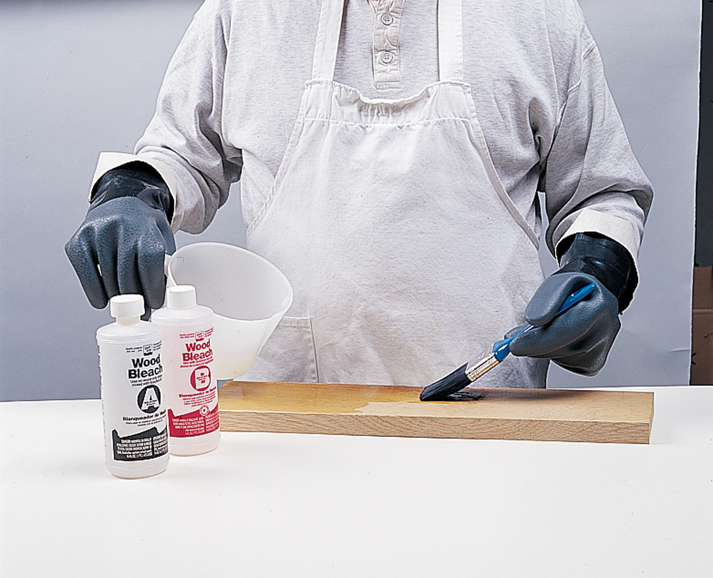 Apply A/B bleach safely. Wear long neoprene gloves, with ends cuffed to catch drips, a waterproof apron, and goggles. Brush carefully. A/B bleach is extremely caustic and will quickly burn your skin and eyes.