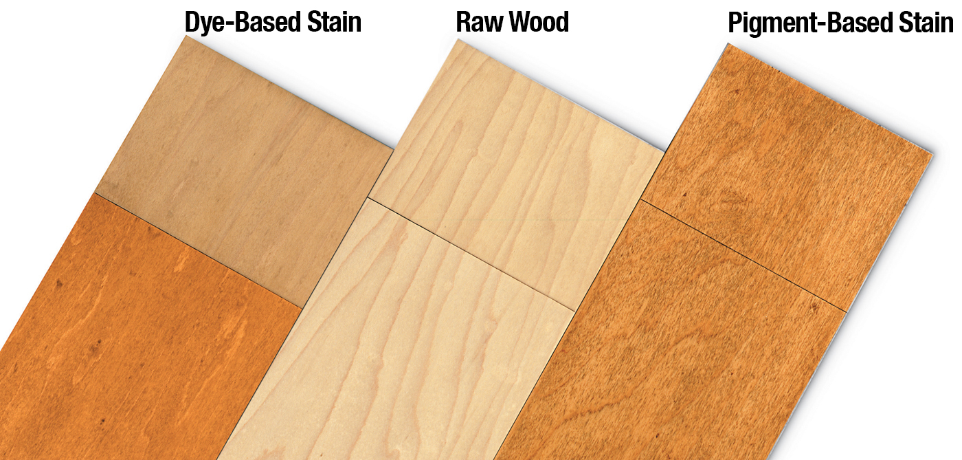 Chlorine bleach, full strength, easily removes most dye-based stain (left) but will not bleach raw wood white (center), nor will it remove pigment-based stain (right).