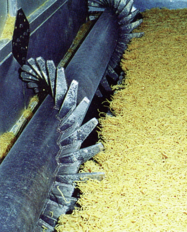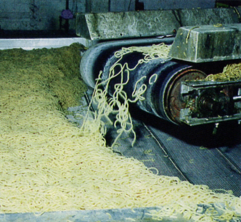 The concentrated glue is then chilled and run through an extruder, where the solid glue is shaped into “noodles” and then dried.