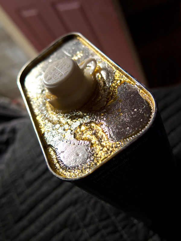 Plain linseed oil is a drying oil, meaning it will stiffen and dry when exposed to oxygen. But it takes a long time for this to happen – it can be days, depending on the ambient temperature. And so historically linseed oil was heated – sometimes with lead – to significantly shorten its drying time. Today linseed oil is transformed into “boiled linseed oil” by adding metallic dryers.