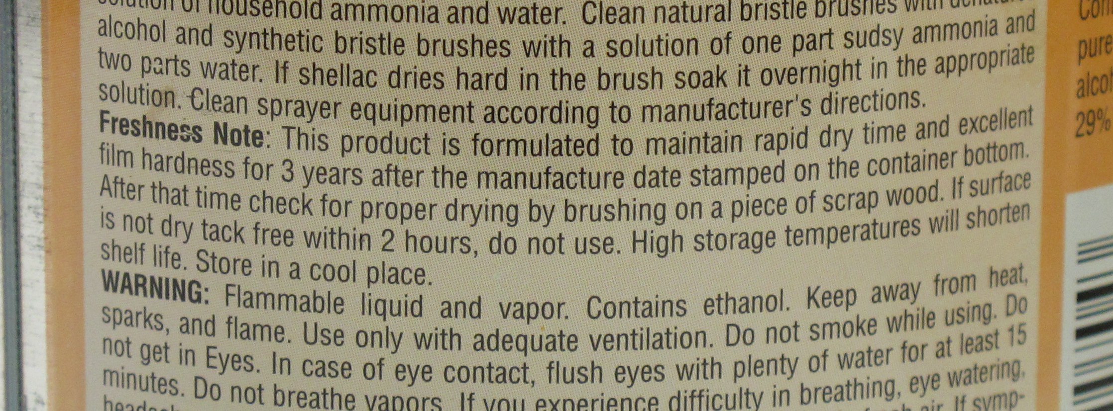 It used to be that Zinsser, which is now the only U.S. company supplying already-dissolved shellac, stamped the date of manufacture on the can, usually on the bottom. The company also told you on the label that the shelf life was three years. As I mentioned, the three-year claim is disputed, but at least the company put some time limit on the product.