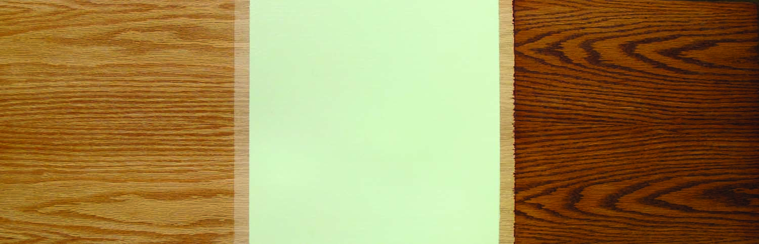 Finish on oak. On this oak panel, a clear finish was applied to the left section, paint to the middle section and a stain and clear finish to the right section.
