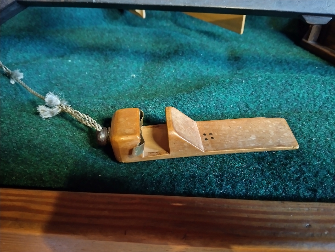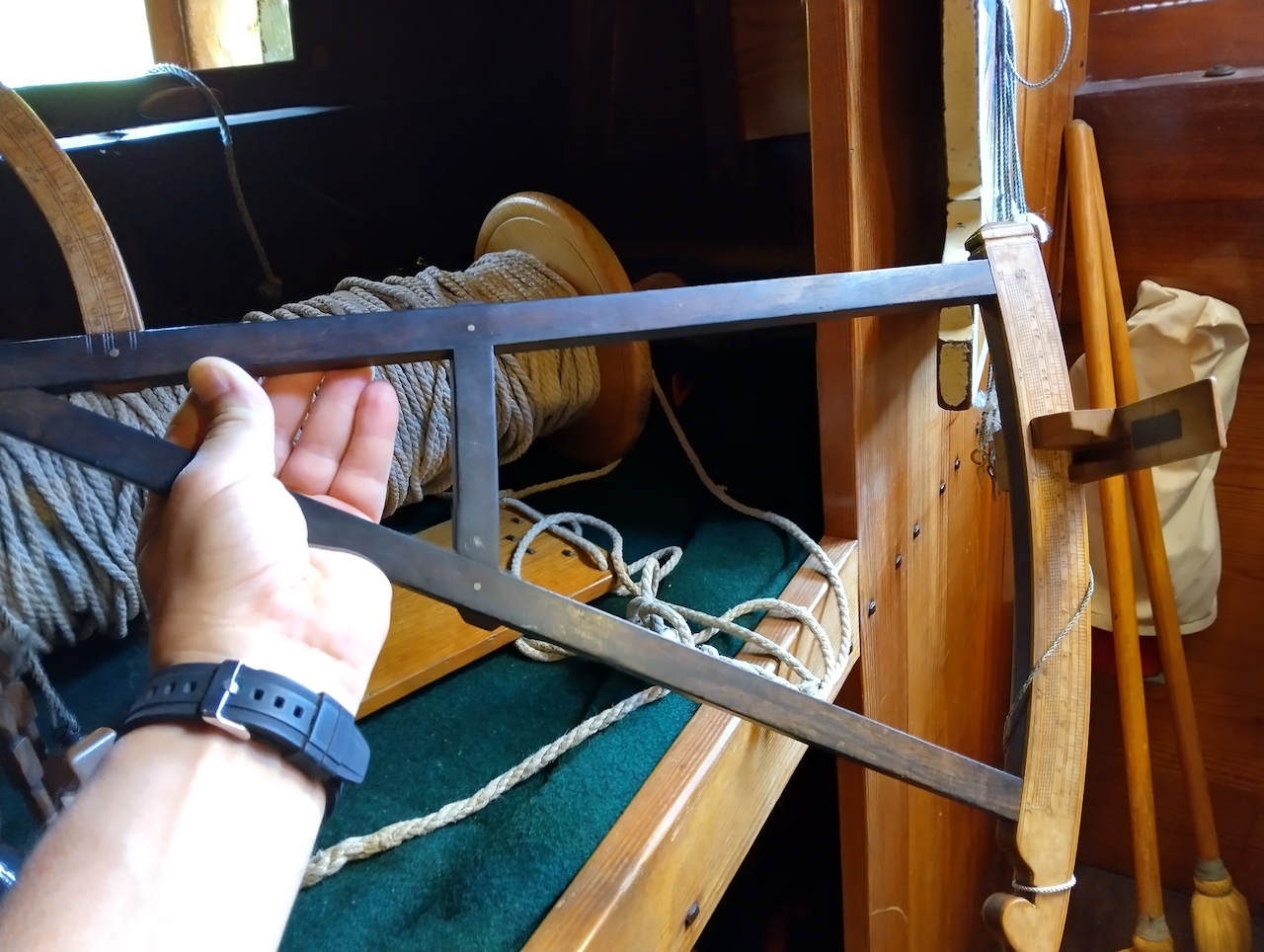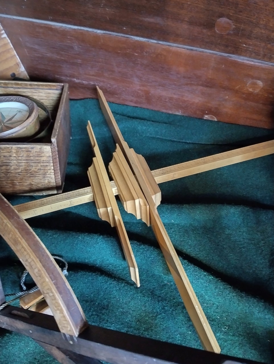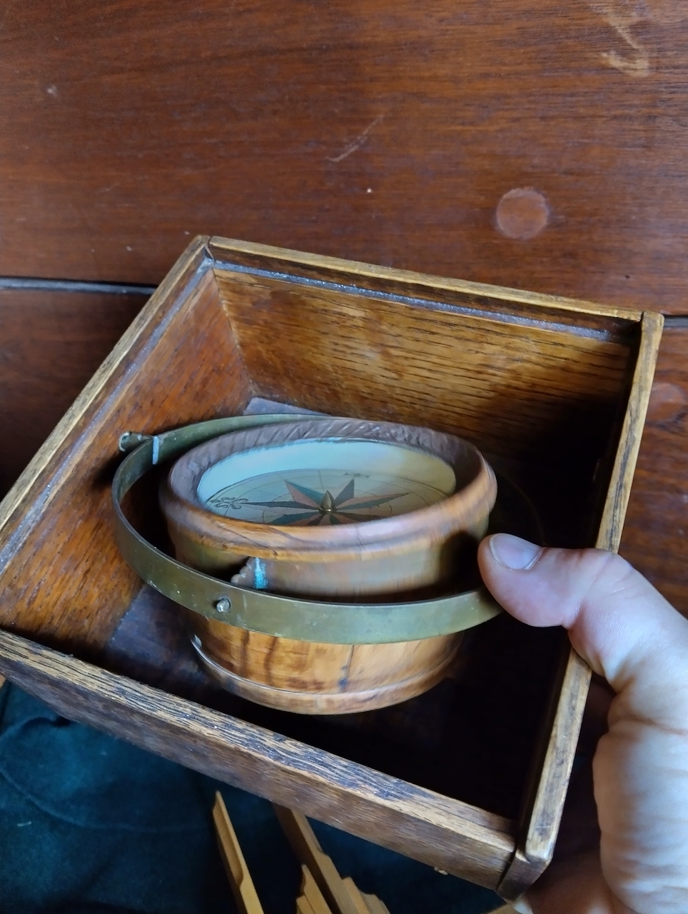 I also managed to get a photo of a compass box. It’s a beautiful wooden housing containing a metal gimbal—a pivot system that allows the compass to remain level even as the ship pitches and rolls in rough weather. Except for the gimbal rings and the needle itself, the entire protective assembly is a masterclass in small-box construction.