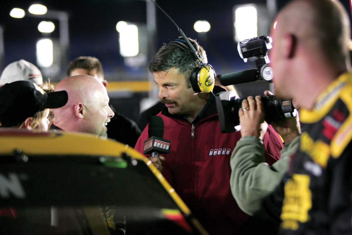 What does the smell of oil, rubber and exhaust have to do with woodworking? Plenty, if you’re John Roberts and Ray Dunlap, two passionate woodworkers who also happen to be famous names in the world of NASCAR. John (above left, with Kevin Harvick) is the host of SPEED TV’S NASCAR RaceDay pre-race show. Ray (above right, with Todd Bodine) is a pit reporter in NASCAR’s Craftsman Truck Series. Both of these guys enjoyed woodworking well before they started their current careers and have their own woodshops in the same town in North Carolina. They see their shops as a place to balance their fast-paced NASCAR careers with a bit of tranquility.