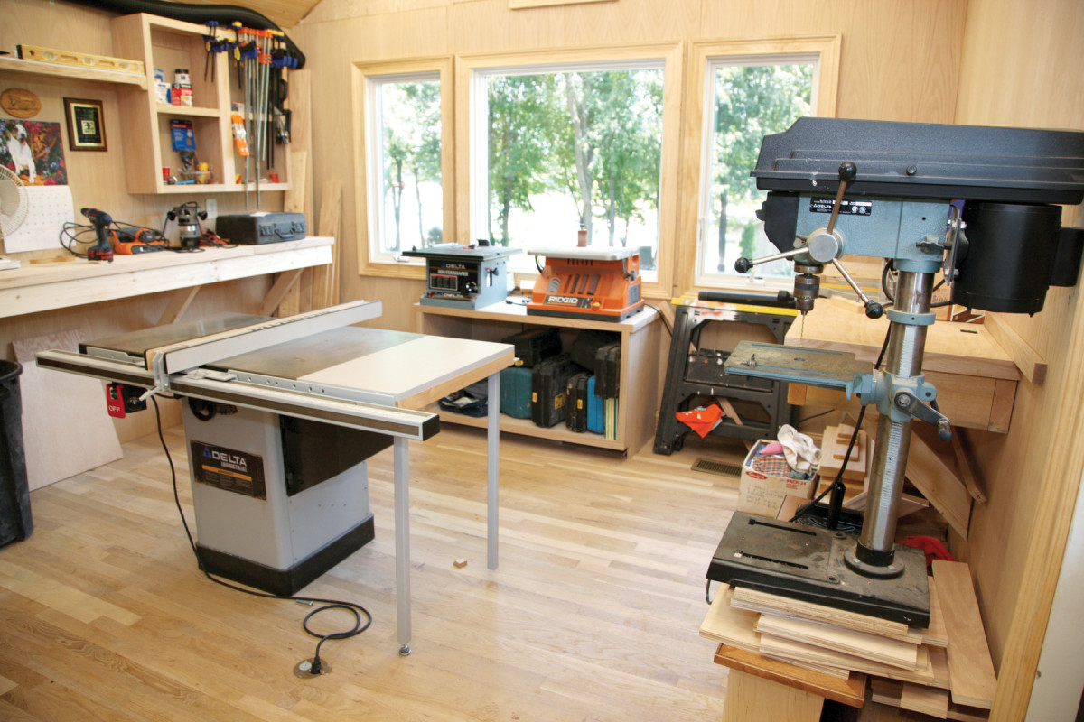 Tired of bumping and banging with cars, bikes and other family storage needs in a cramped garage shop, John has recently pulled away from the field, completing a brand-new shop with enormous windows that overlook his backyard and Lake Norman in North Carolina. “I definitely built my shop for the gorgeous view of the lake and the boats. There’s nothing better than woodworking while looking out over the water.” John laid out the shop just the way he wanted, and even though he was out of town for most of the construction, he did much of the finish carpentry work himself.