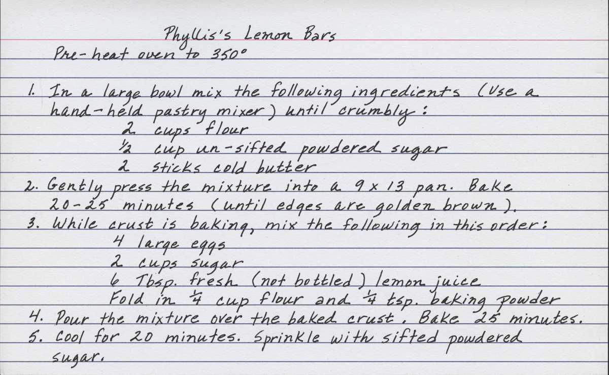 Recipe for lemon bars(“Curved-Lid Recipe Box,” page 34)