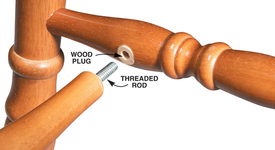 My kitchen chairs are hardly valuable antiques, so when I broke a rung on one I wanted a strong but simple fix. I drilled out the broken tenon from the mortise and plugged it with a piece of wood. Then I trimmed off the end of the broken tenon on the stretcher and drilled a 1/4-in.-dia. by 1-in.-deep hole into the end. I epoxy glued a 1-3/4-in. piece of threaded rod into this hole. Then I drilled out a corresponding hole into the wood plug and epoxy glued the threaded rod into the wood plug. Epoxy glue is a great gap-filling glue, which means the alignment of the threaded rod doesn’t have to be perfect. This fix may seem a bit rough, but it works, and besides—this chair will never be on “Antiques Roadshow.”