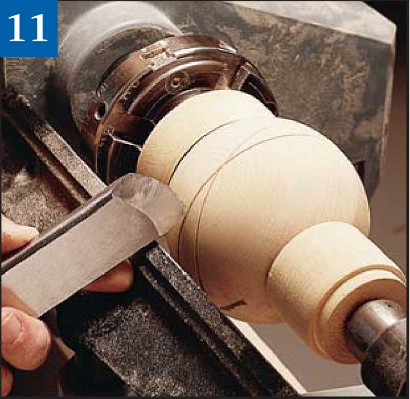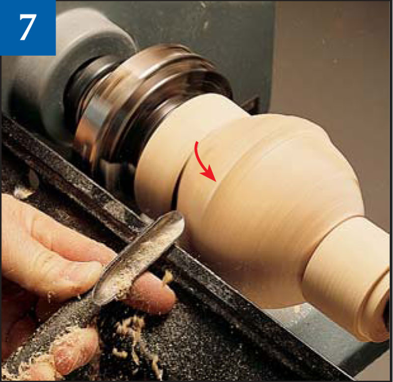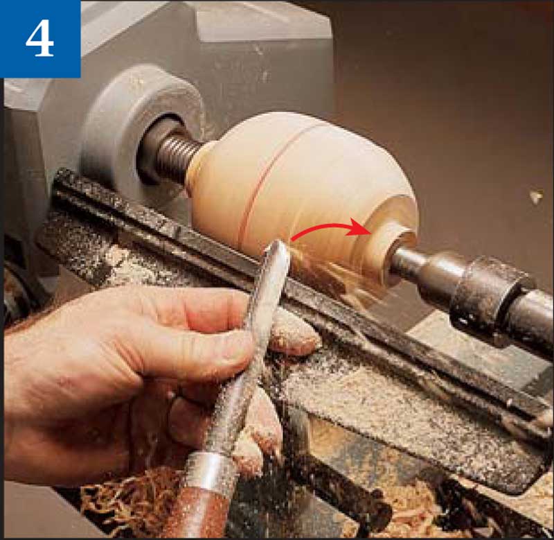 7. Turn down to the ghost ball, using a 1/2-in. detailing gouge with a fingernail shape. Work from smaller to larger diameters on both sides of the centerline (the ball now has the same grain orientation as a face-grain bowl). Go slowly and gently, with a mixture of cutting and light scraping actions to remove waste surrounding the ghost ball.