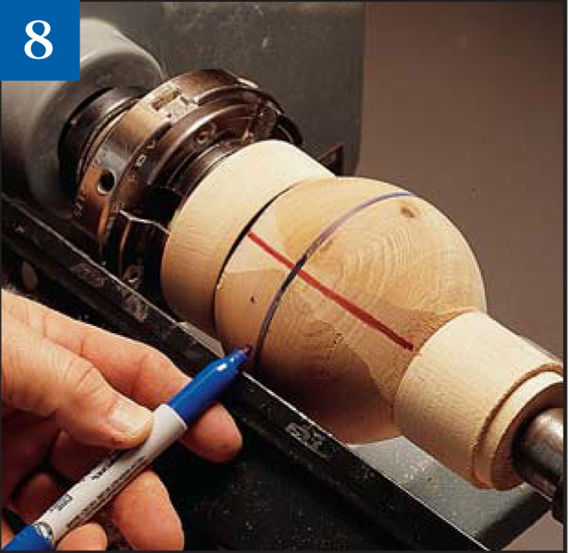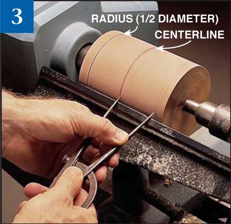 3. Lay out the size of the ball with dividers or a compass after roughing out the blank to a cylinder. Mark the centerline (red) and two radius lines (blue) that are equal to half the dia. of the cylinder. After marking, reduce the waste outside of the radius lines to approx. 1 in. in dia.
