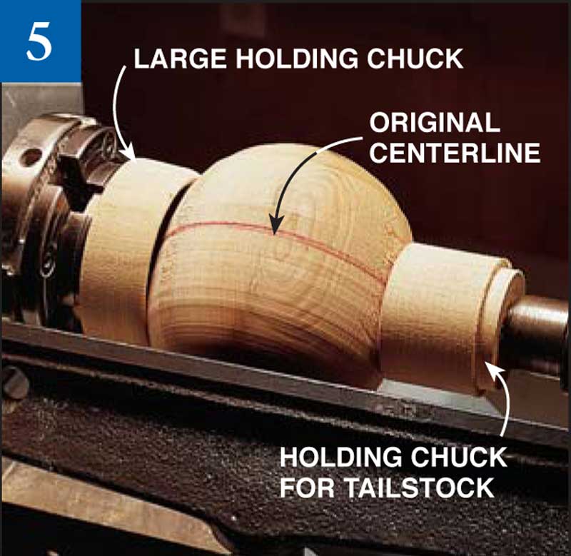 5. Mount the rough ball between the two holding chucks with the red centerline turned 90 degrees so it’s parallel to the bed or axis of the lathe. Rotate the lathe by hand a few times to be sure both sides of the red line are in alignment.When all seems right, firmly secure the block by tightening the tailstock.