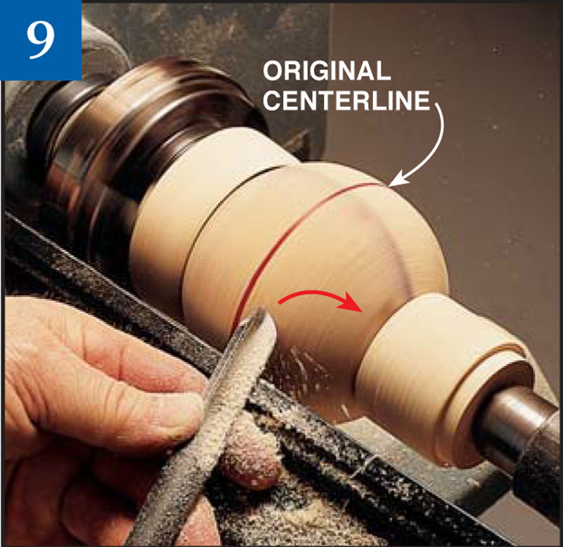 9. Continue turning with the blue line positioned parallel to the lathe’s axis. The grain is again as we started (indicated by the red line), so work from larger to smaller diameter in order to work with the grain. Gently turn away the waste that was held in the holding chucks. Again, use the ghost ball as a guide.