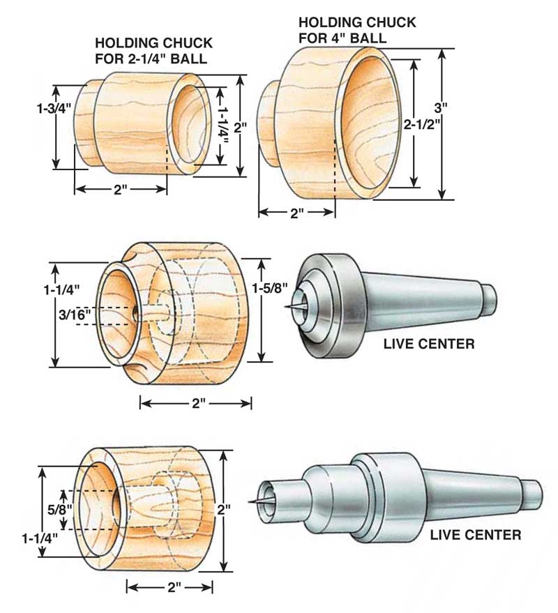 • Basswood (or poplar) 3 by 3 by 2-in. in length (headstock side holding chuck for larger ball); two pieces 2 by 2 by 2 (headstock side holding chuck for smaller ball and for tailstock-side holding chuck that fits over the live center).