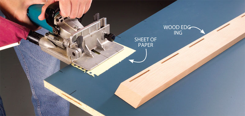 1. Use biscuits to avoid alignment nightmares. You’ll never have a wood edge dip below the laminate surface if you cut the slots so the wood edge sets just a smidgen above the laminated top. To do this, cut the slots in the wood edging first. Then use the same setting with a sheet of paper under the fence to cut the slots in the laminated top. Use No. 20 biscuits and set the slots 4 in. to 6 in. apart.