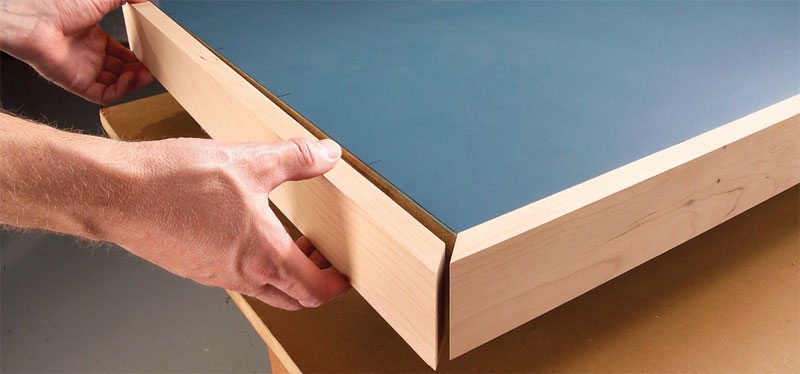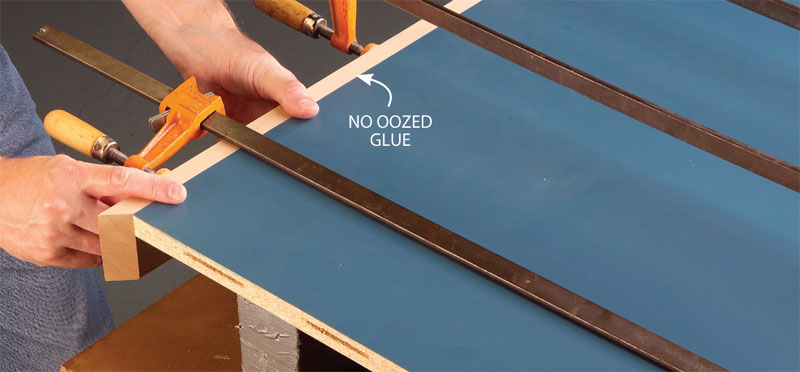 Most woodworkers cringe at the thought of applying wood edging to a plastic-laminated top. Unlike wood veneer surfaces, you can’t sand this edging flush without scratching the laminate. Over the years, I’ve discovered a few tricks of the trade that will help you avoid messy glue-ups and misaligned edging.
