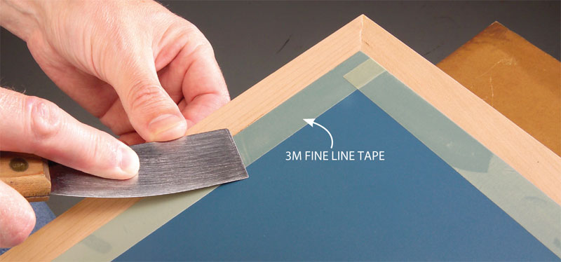 4. Get a clean crisp finish line using 3M’s Scotch Fine Line Tape (see Source, below). This is truly a “magic” masking tape! Originally designed for auto bodywork, it makes an airtight seal that no finish can sneak under. Apply the tape to the laminate with your fingers first. Then, to make a tight seal, use a putty knife to slowly, gently press down the tape.