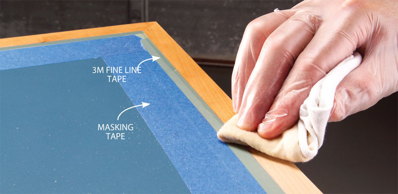 5. Wipe on two or three coats of Danish oil or brush on varnish or lacquer, you name it—this tape will keep a perfect seal. Overlap a row of 2-in. blue masking tape on the Fine Line tape for an extra layer of protection, or if you’re finishing with lacquer, make the overlap using green masking tape formulated for lacquer. Remove the tape after the finish dries. You’ll find a sharp finish line and perfectly clean laminate.