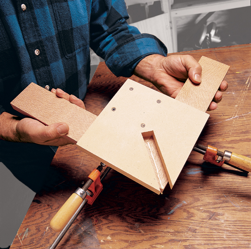 To make this jig, cut a diagonal notch halfway across a 7-in.-square piece of medium-density fiberboard. The notch lets you see if the joint is closed on the underside, as well as letting the glue dry thoroughly. For the clamping block, glue together two 4-in. squares of plywood, drill a 2-in. hole in the middle, and screw this assembly to the fiberboard with one square corner over the slot. Be sure the corner of the block is square, or your precisely- cut 45-degree joint faces won’t be flush when you clamp them together.