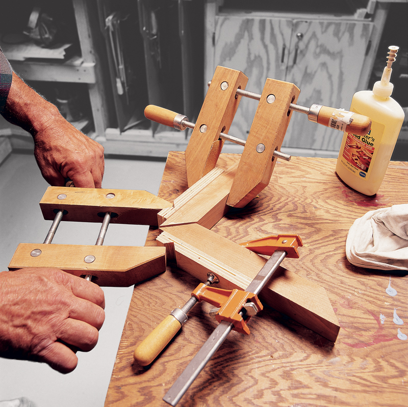 If you’re gluing a box with mitered corners, cut several plywood triangles, and screw them together into a triangular block. Cut off the inside corner so it doesn’t interfere with the joint. Without glue, clamp the boards onto the triangular block, and when the joint’s perfectly aligned, remove one board, apply glue, and reclamp.