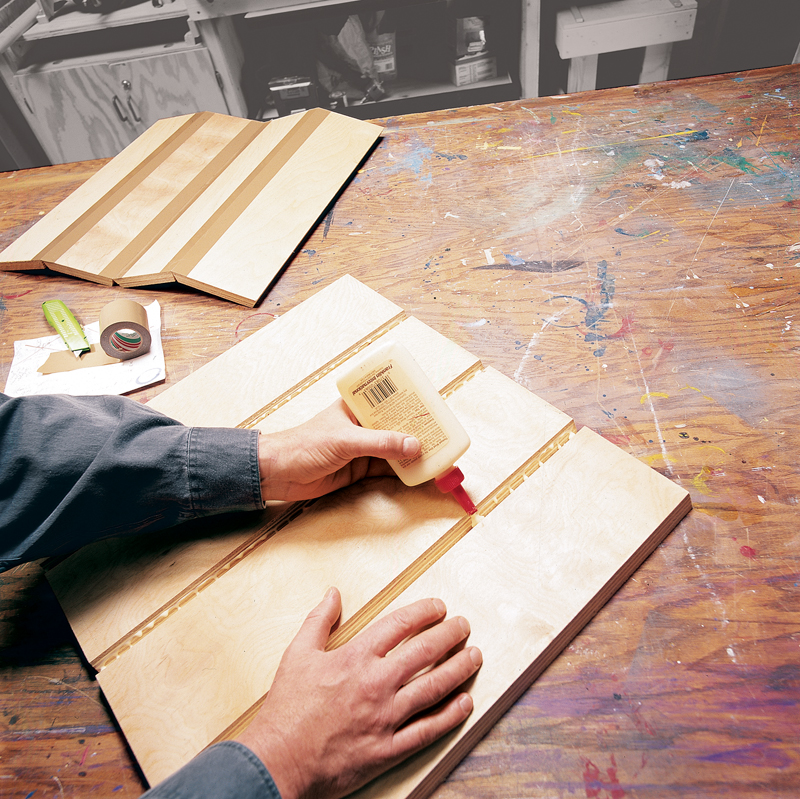 When you’re finishing a plywood tabletop or cabinet door with mitered edging, cut four short pieces with a 45-degree angle on one end. The short pieces work great to help size and locate the edging. Tape and clamp the short pieces in place on two of the opposite faces, then glue on the first two edging strips. Remove the short blocks so they don’t get glued on.