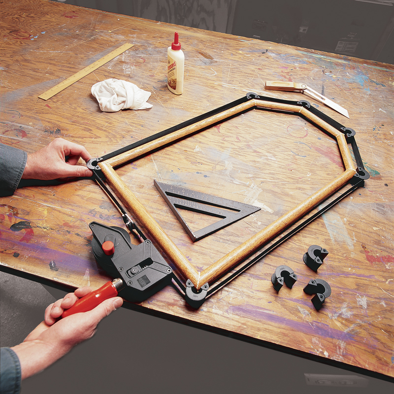 If you’re building smaller miter joints, give this clamp a try. It works especially well for assembling narrow frames that don’t require a ton of clamping pressure. It has a geared winder that tightens and rolls up the band on both sides, and a handle you twist to increase the pressure. Slotted angle-clips press on each corner keeping pressure uniform. The jaws on the circular clips adjust to any angle. $31 for the clamp and four angle clips. A box of six extra clips costs $14.