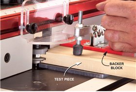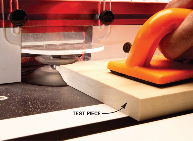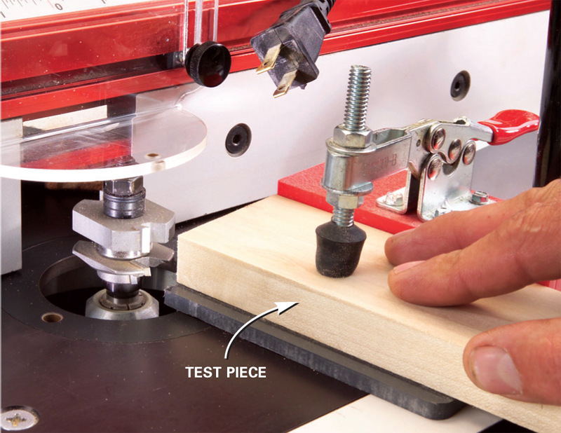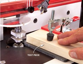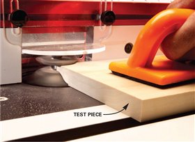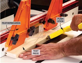 9. Make a long-grain test cut in a scrap piece. Use featherboards