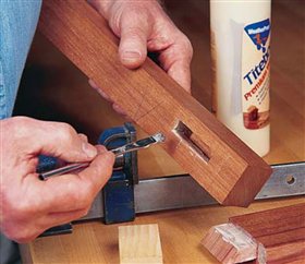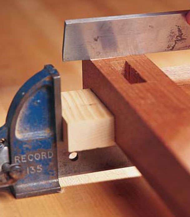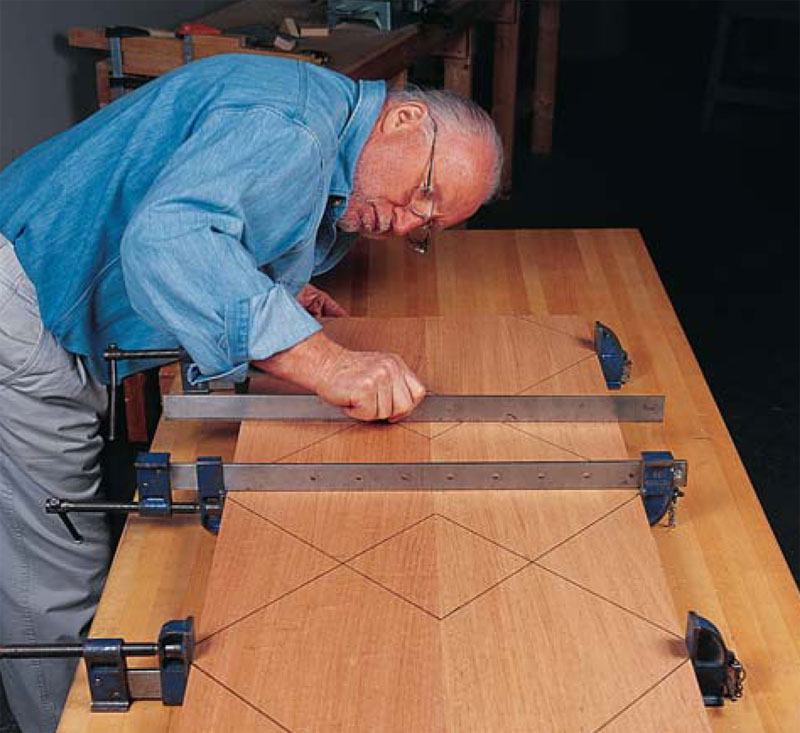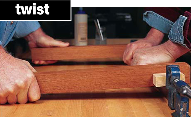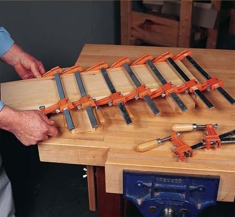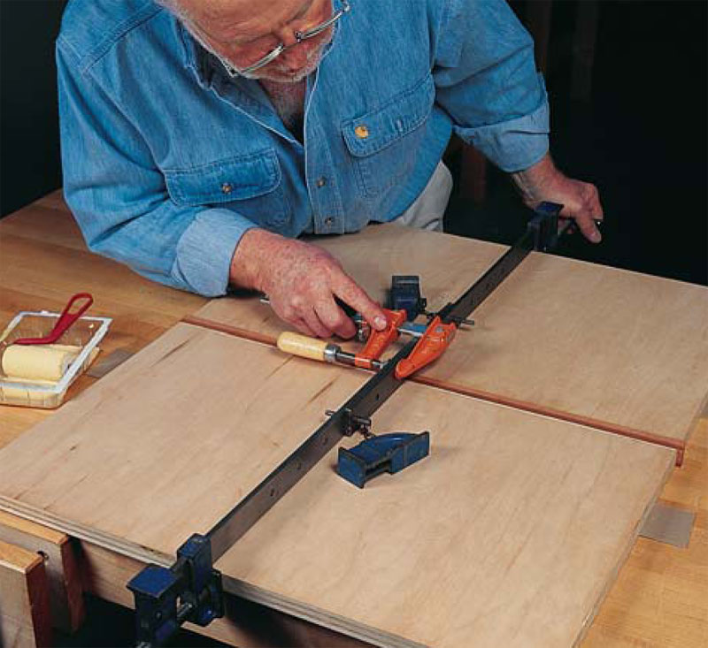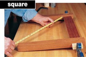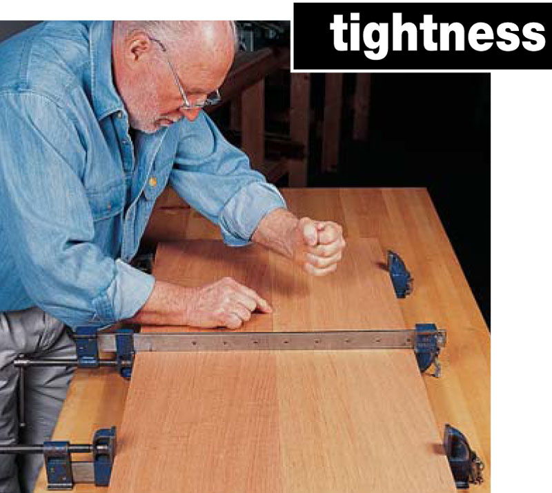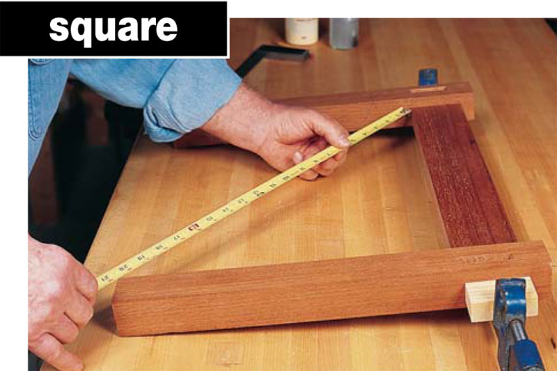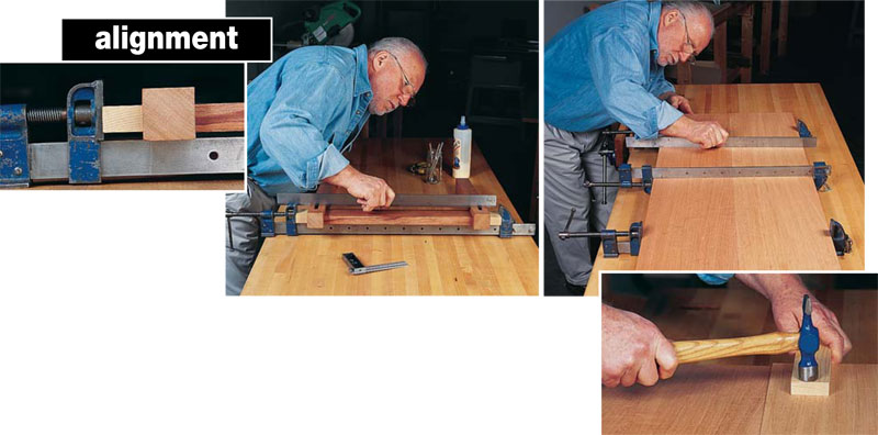 down to align the legs’ faces. Panels: Use a straightedge and your fingertips to check across the joint.To make corrections, loosen the clamps a tad and push or tap the board