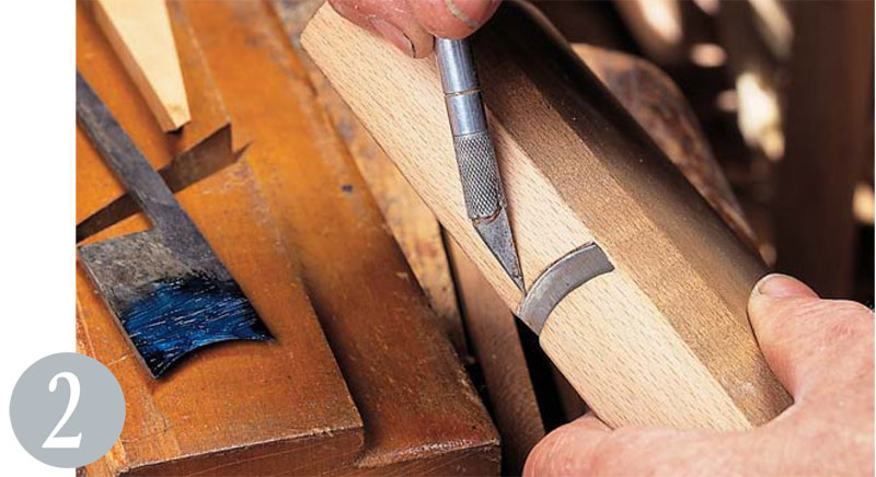 2. Scribing a round iron. To transfer the shape of the sole to the plane iron, coat the iron with machinist’s bluing, then scribe it with a knife.