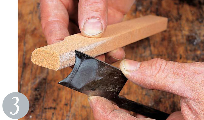 I hone the iron (Photo 3) with a soft, aluminum oxide “roughing” stone. To hone a concave cutting edge, I grind off the stone’s corners using a typical, vitrified, gray grinding wheel.