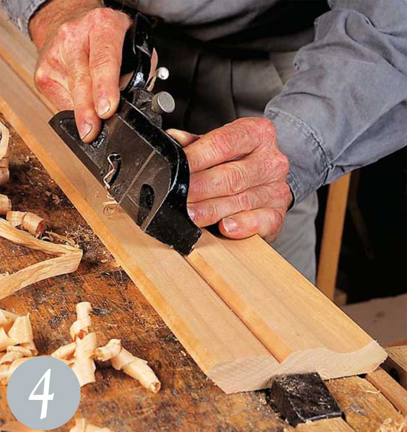 Make each planing pass with a firm, steady stroke. Each complete pass should yield one continuous shaving. If you find yourself fighting the plane, retract the iron slightly. If the plane skips over the middle of the board, try shimming under the center of the molding to raise it a bit.