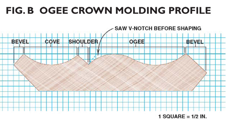 Before planing, you need to do a little tablesaw work: First, saw all the 45- degree bevels on the edges of the molding stock (Fig. B). Then, saw a 45-degree V-shaped notch in the face of the stock to create the shoulder. I use a jack plane to clean up any saw marks on the four edge bevels.