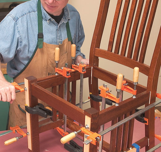 Do a dry fitClamp your pieces without glue to make sure the joints come together tightly. This step also serves as a test for your choice of clamps and blocks. Here, a dry run revealed that I need wedge-shaped strips and a spacer to clamp these tapered legs. |