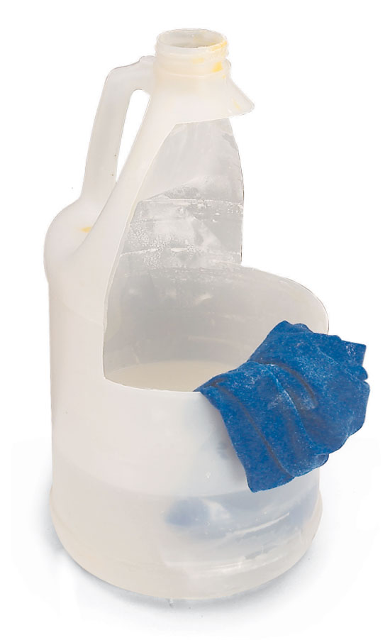 Get ready for a messA cotton rag and a jug of warm water are handy for wiping up spilled glue or lots of squeeze-out. I cut out the side of a plastic jug to make a convenient, disposable container. |