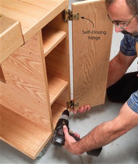 10. Screw the self-closing hinges to the door and fasten the door to the