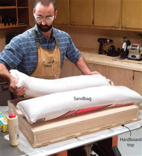 guarantees a flat top. Place the hardboard face down on the saw, spread