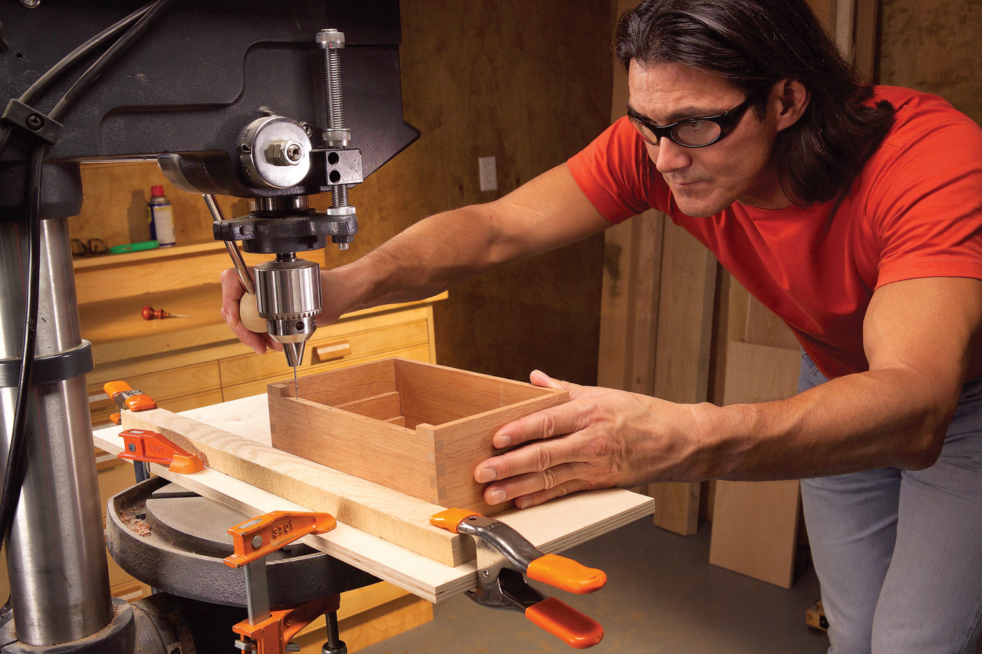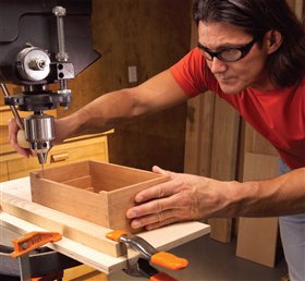 25. The hinge screws are centered on the box’s back edge (Fig. F). Draw or scribe a line down the center of the back. Put the hinge in place and mark the locations of the screw holes with an awl. Set up a drill press with a fence to drill the holes using a 1/16-in. bit.