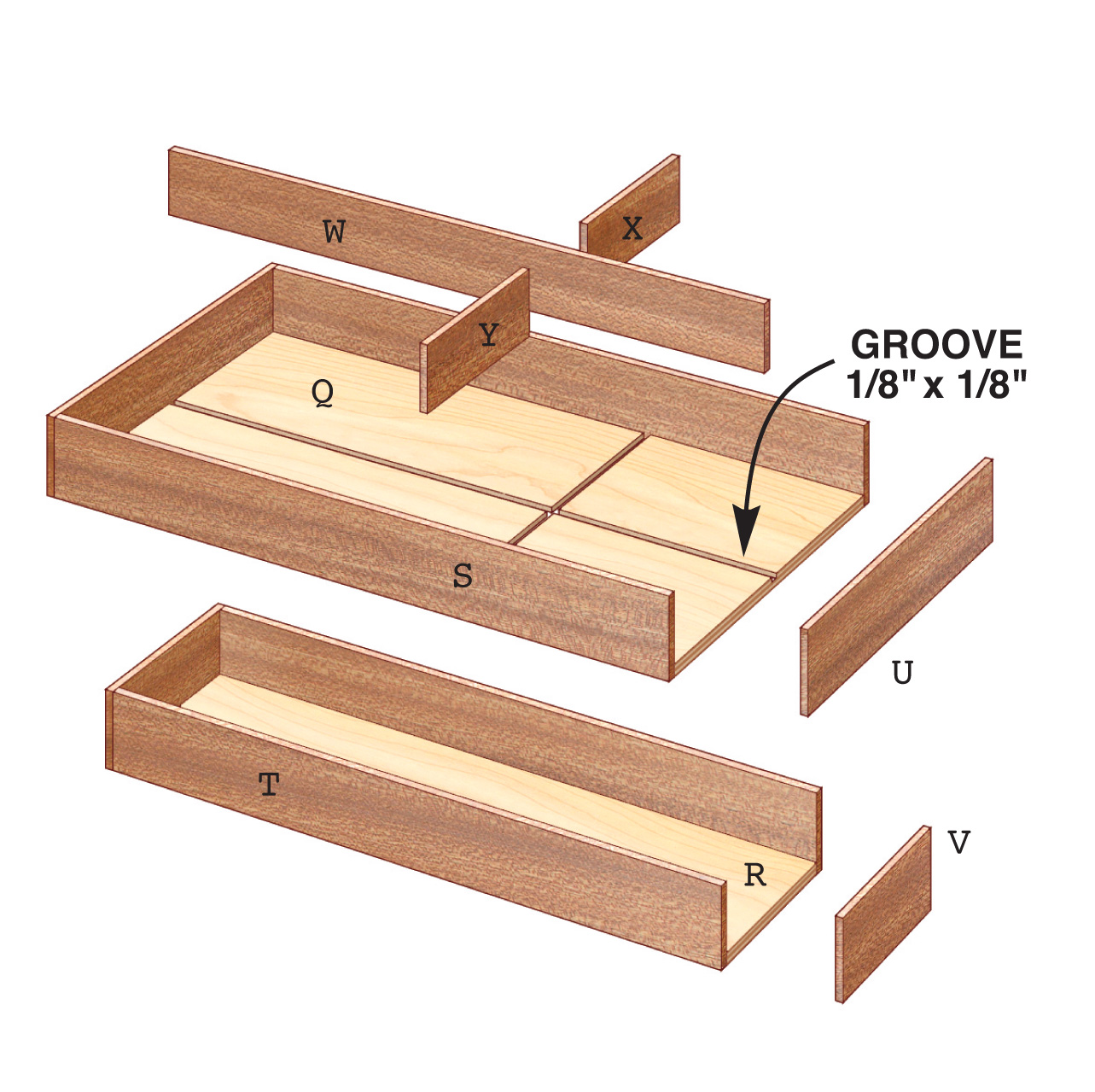 17. Cut the trays’ bottoms (Q, R) to exact width, but leave them 3/4 in. extra long. On the table saw, cut 1/8-in.-wide grooves, 1/8 in. deep, wherever you want to insert dividers (Fig. A).
