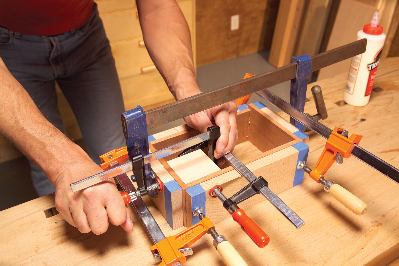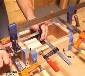 3 Clamp the box together with hardwood cauls. Tape the cauls’ ends to prevent them from sticking to the box. To pull the box square, clamp a block to one inside corner.