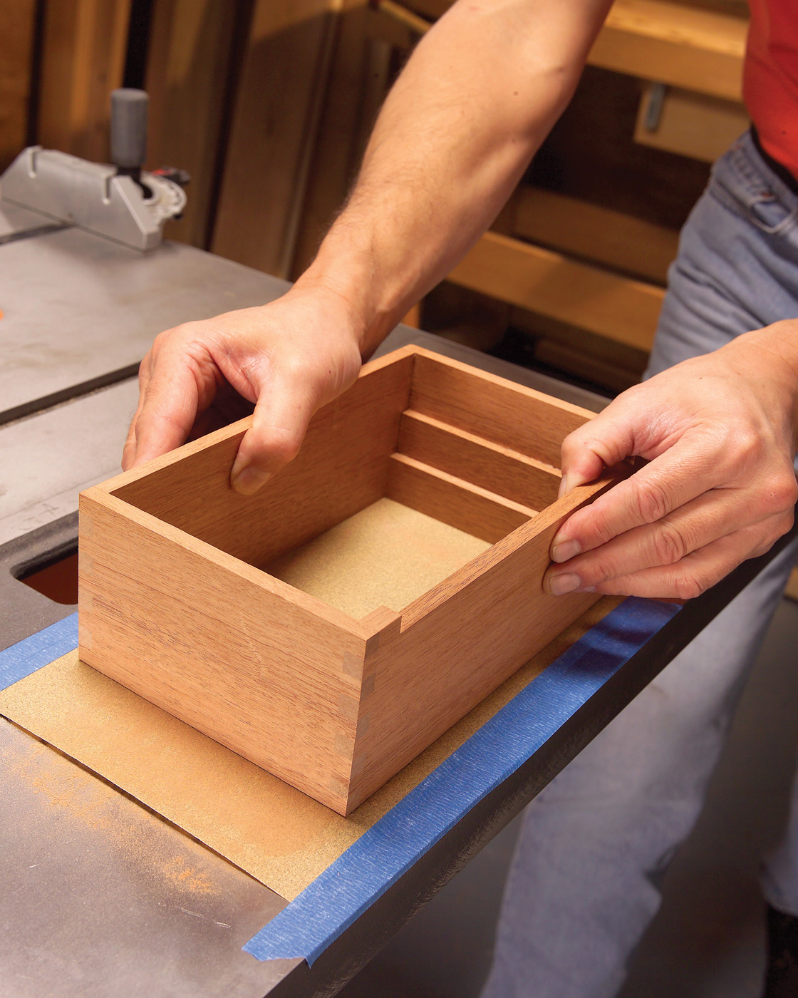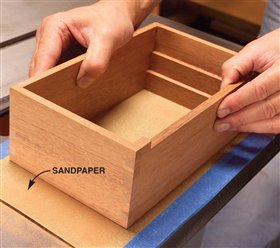 4 Level the bottom of the box on 100-grit sandpaper taped to your table saw. This eliminates annoying gaps between the box and its base. Level the top edge by sanding, too.
