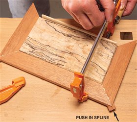 12. Glue the short frame pieces first. Be fussy about aligning their miters with the panel’s corners. Let the glue dry overnight. Then add the long frame pieces, one at a time. Align the miters first; then push in the spline from the joints’ ends.