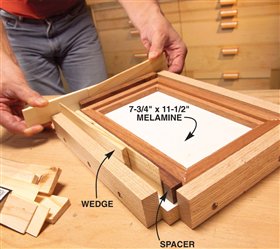 11 Glue the base. Thin pieces can be difficult to clamp, so I borrowed a jig that musical instrument makers use. Clamping pressure is applied by sliding together two opposed wedges (carpenter’s shims). Use the same jig for gluing the sides of the trays to 1/4-in. plywood.