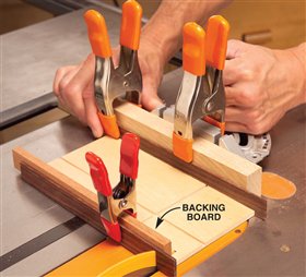 12 Crosscut the trays after gluing on their long sides. The tray’s corners are simply butt joints, so this cut ensures the tray’s bottom and sides are perfectly flush. Use backing boards behind both side pieces to eliminate any chance of chip-out.